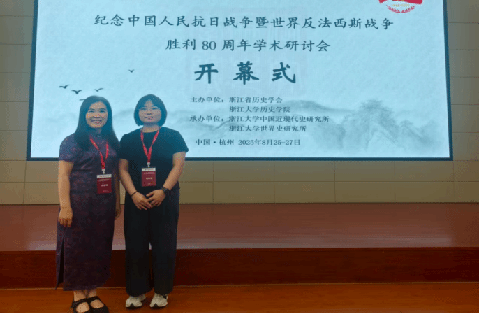 2025年8月25—27日,纪念中国人民抗日战争暨世界反法西斯战争胜利 80周年学术研讨会在杭州成功召开。此次会议由浙江省历史学会与浙江大学历史学院主办,浙江大学中国近现代史研究所及浙江大学世界历史研究所共同承办。来自浙江大学、南京大学、华南理工大学、电子科技大学、杭州师范大学、浙江省社科院、山西省社科院、福建省委党校等二十多所高校及科研单位的专家学者与会,YABO鸭脖官网银龄教师徐树英、中国近现代史纲要教研室教师徐亚旭应邀参会。
