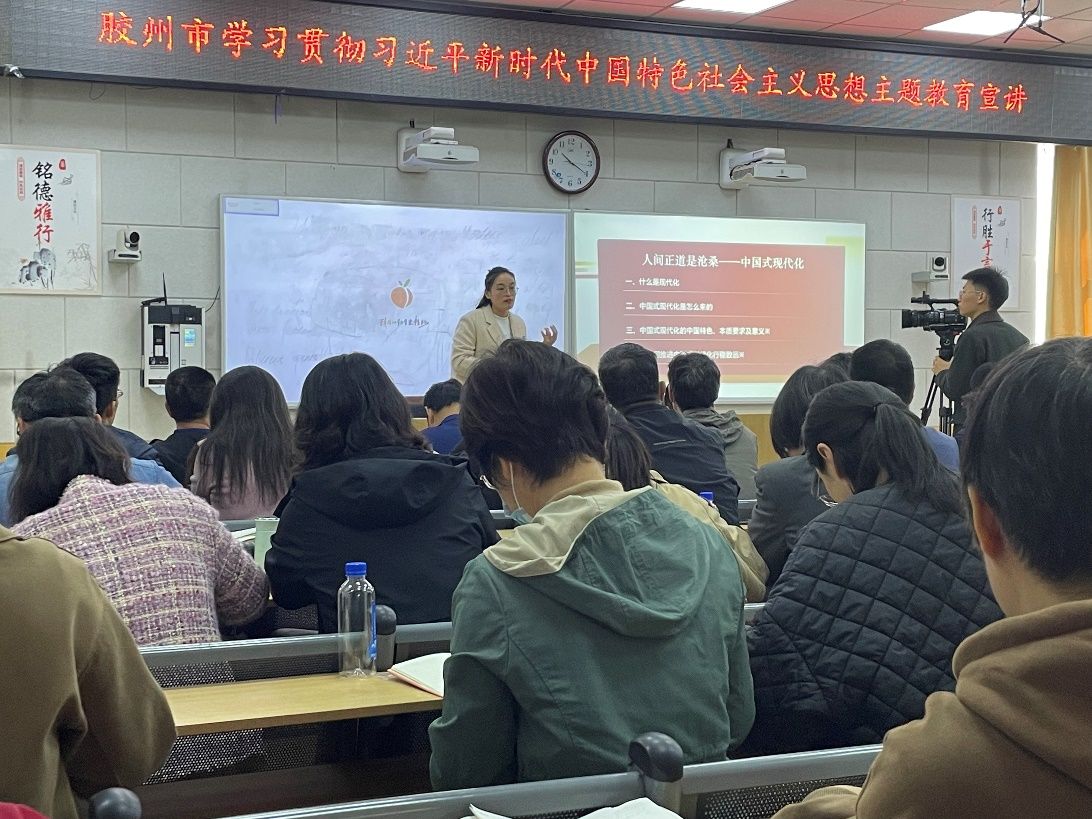 为深入学习贯彻习近平新时代中国特色社会主义思想主题教育,全面贯彻落实党的二十大精神这一主线,深入学习领会新时代党的创新理论蕴含的道理学理哲理,11月7日—11月10日,YABO鸭脖官网任重教授、姜文文主任在胶州市学习贯彻习近平新时代中国特色社会主义思想主题教育宣讲系列活动中做了相关主题宣讲。