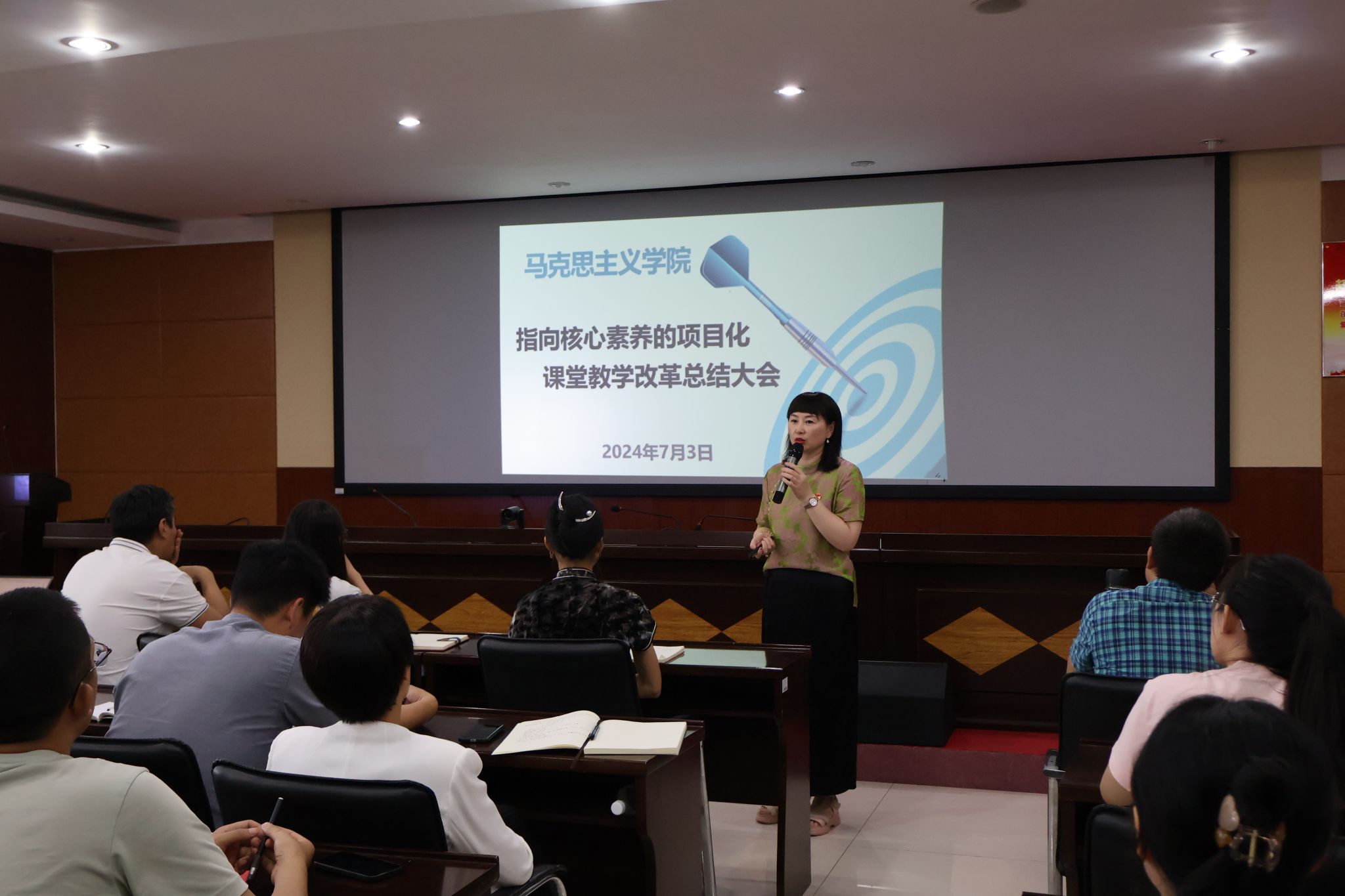 会上,刘院长分别从改革过程、改革内容和改革成效三个方面,详细介绍了马院本学期项目化教学改革的主要情况。从项目化教学启动以来,经过集体备课、典型示范、过程监控和成果总结,学院在创新教学模式、提升教学质量等方面取得显著成效。刘院长强调,此次项目化教学改革以教案为抓手,以项目方案为关键,以课堂为核心,以成绩构成为重点,以评价方式为保障,改革内容囊括教学内容、教学方式和教学评价,贯穿课前、课中和课后,形成全覆盖、全方位和全过程的指向核心素养的项目化教学改革成果。