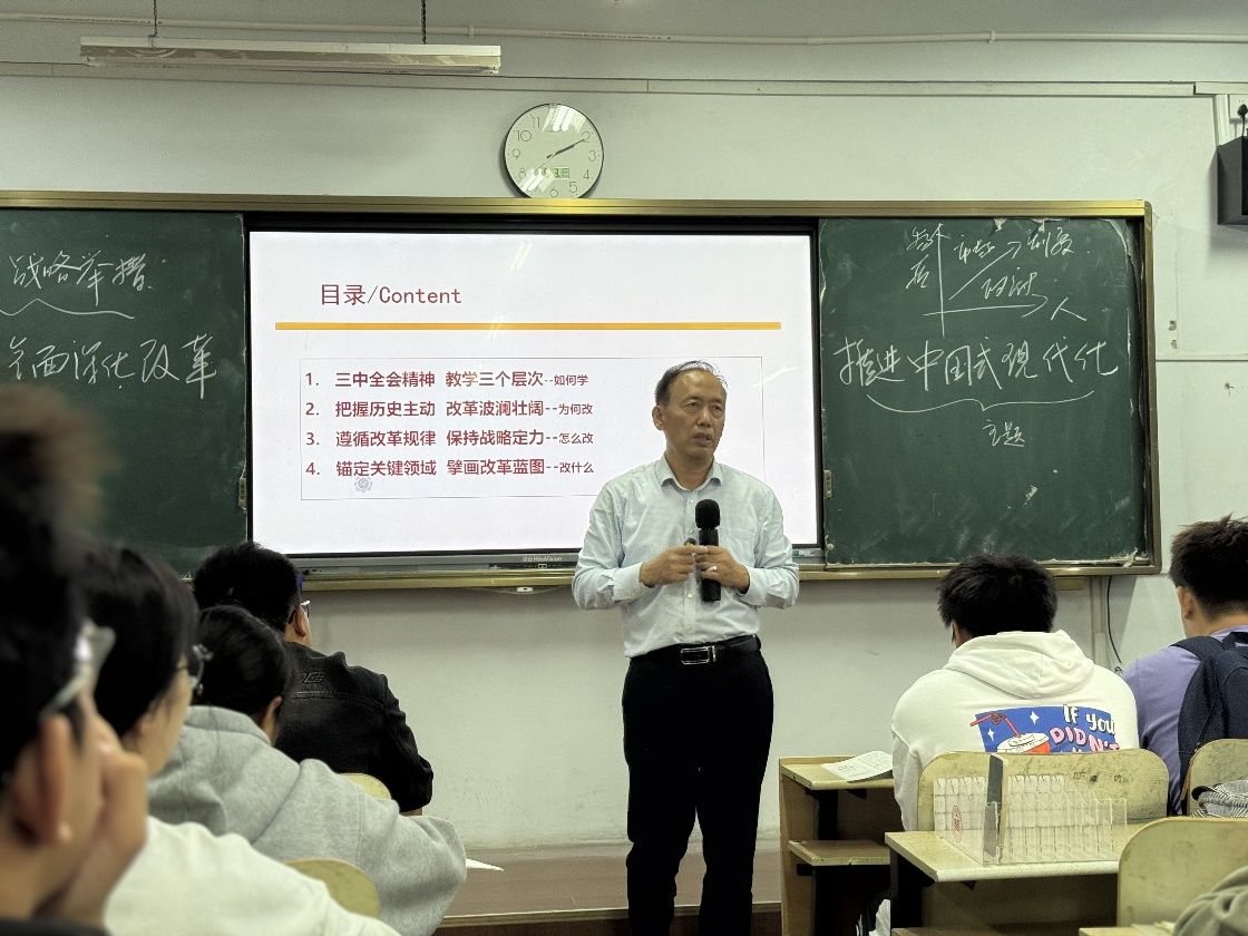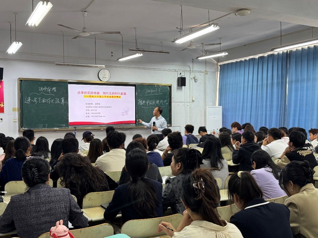 党的二十届三中全会,是在以中国式现代化全面推进强国建设、民族复兴历史伟业的关键时刻召开的重要会议。为深入学习宣传贯彻党的二十届三中全会精神,推动学院师生深刻认识进一步全面深化改革、推进中国式现代化的重要意义,10月16日下午,YABO鸭脖官网毛泽东思想和中国特色社会主义理论体系概论教研室、习近平新时代中国特色社会主义思想概论教研室、形势与政策教研室全体教师共同学习二十届三中全会精神专题课。郝明杨教授以“改革的实践续篇 现代化的时代新篇”为主题对党的二十届三中全会精神进行解读。