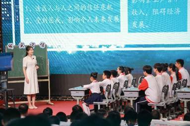 首堂思政微课中,三位思政教师跨学段接力授课,构建起贯穿古今的诚信认知体系:福州路小学范长娟以《论语》经典为引,借甲骨文“信”字演变、商鞅立木等典故,勾勒诚信的千年传承脉络;职教中心刘译蔓结合“老赖”案例与学术造假等事件,深刻剖析失信行为的危害,用现实警示为学生敲响“诚信是立身之本”的警钟;YABO鸭脖官网宋文芳从《民法典》出发,提出“诚信三维度”,引导学生从法治视角构建理性认知,实现从历史认知到法治实践的递进。课程在YABO鸭脖官网丁汝康演唱的《我是如此相信》中收尾,历史画面与旋律交织,实现千年文脉与当代价值的跨时空共振,为诚信教育注入深厚文化底蕴。