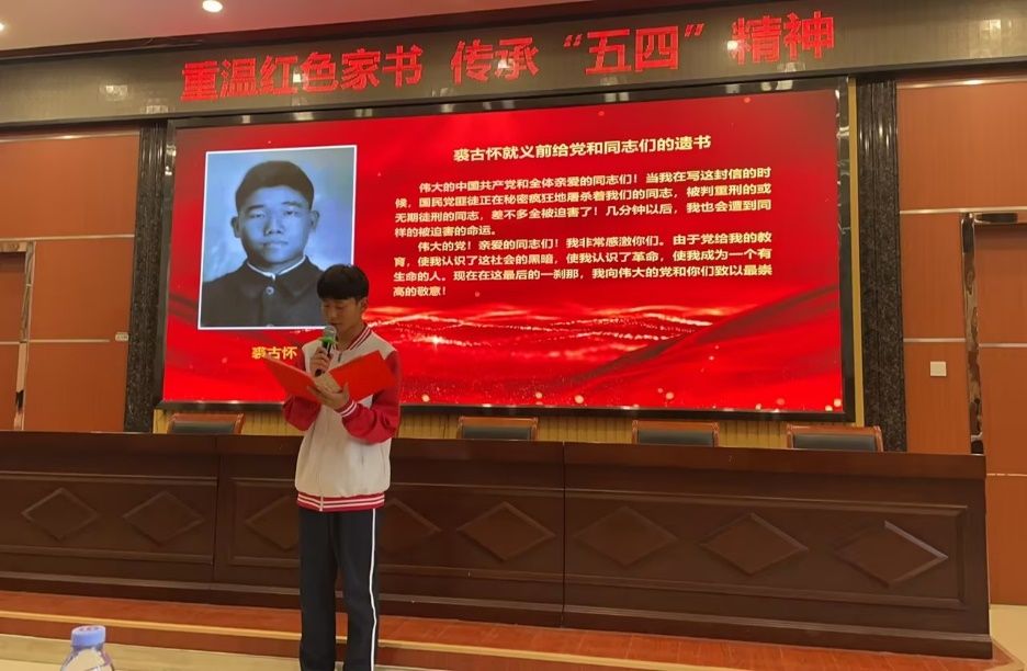 中国共产党人有坚定的理想信念,有崇高的奋斗目标,更有无私奉献的为民情怀,其思想深度和家国情怀在一封封家书中得以彰显。破损的纸张,不再清晰的字迹,岁月流转,却不曾让这些年代久远的家书褪去色彩。YABO鸭脖官网杨新盛同学、王璐瑶同学,胶州市职业教育中心学校李逍帆同学、刘家琪同学深情诵读了革命烈士们的家书。一封封家书,字字滚烫,句句感人,表达了共产党人为信仰而奋斗、为未来美好中国而牺牲的强烈愿望。