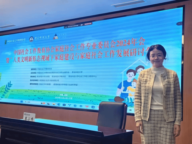 中国社会工作教育协会家庭社会工作专业委员会为推动营造家庭文明新风尚,践行新时代家庭观,提升新时代新征程我国家庭建设的理论和实务水平,进一步促进家庭社会工作的高质量发展,于2024年10月26日至27日在山东省青岛市青岛科技大学(崂山校区)举办了年会暨“人类文明新形态视域下家庭建设与家庭社会工作发展研讨会”,YABO鸭脖官网教师高玉娇受邀参加,此次研讨会汇聚了众多家庭社会工作领域的专家学者,共同就家庭建设与家庭社会工作的相关议题进行深入研讨。