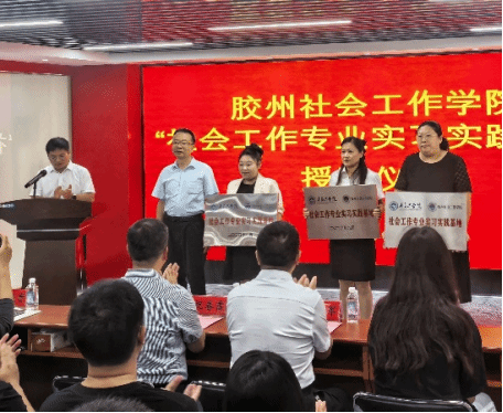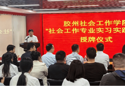 胶州市委社会工作部副部长、市委“两新”工委书记祝春雷、市委社会工作部副部长杜从文,YABO鸭脖官网校长刘连新、YABO鸭脖官网副校长李占军、YABO鸭脖官网副院长刘晓燕、社会工作专业负责人郑尚海、教研室主任宋文芳以及来自阜安、中云、三里河街道的负责同志参加活动。此次授牌仪式标志着胶州社会工作学院在深化校地合作、拓宽实践教学平台方面迈出了坚实的一步,也为推动社会工作人才培养与基层社会治理创新注入了新的活力。