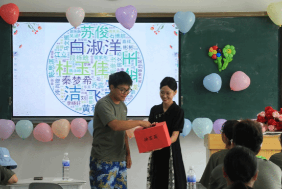 一幅精心设计的词云图缓缓出现在大屏幕上,图中包含了全体社会工作专业同学的姓名。随后,社会工作教研室主任宋文芳在抽签箱中随机抽取一位同学的名牌,用一个词语描述该同学,并将名牌别在该同学胸前,象征着正式成为社工大家庭的一员。紧接着,该生承担起“传递者”的角色,从抽签箱中抽取下一位同学的名牌,用一个词语描述该同学,以此类推。